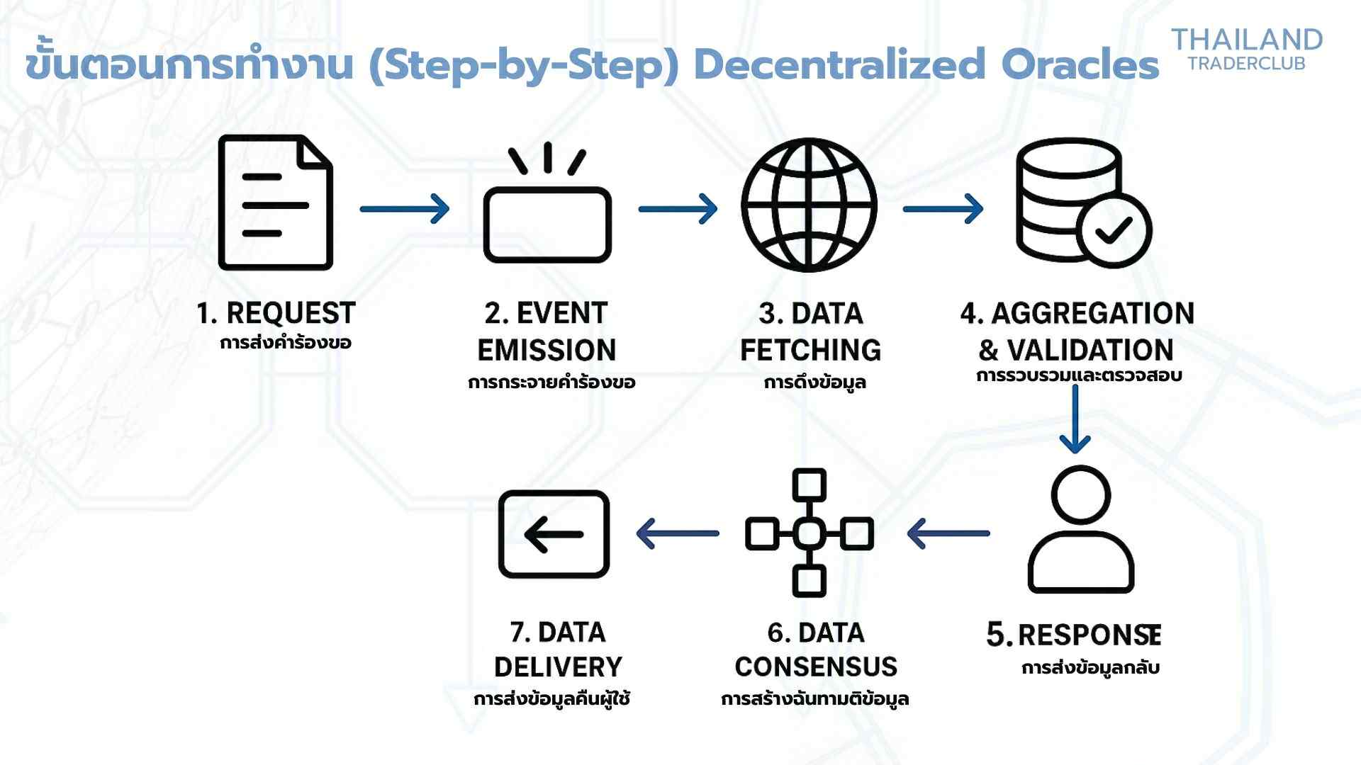 "Decentralized Oracles ถูกสร้างขึ้นมาเพื่อแก้ปัญหานี้โดยเฉพาะ โดยใช้เครือข่ายของผู้ให้บริการข้อมูลที่หลากหลายและเป็นอิสระต่อกัน เพื่อลดความเสี่ยงจากการพึ่งพาแหล่งข้อมูลเพียงแหล่งเดียว"